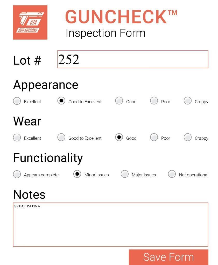 TERMS & CONDITIONS: The highest bidder shall be the purchaser and the decision of the auctioneer relating to all matters is final. All sales are final however, we do warranty the guns we sell will function or we will repair at our cost. While we improve the quality transparency through GUNCHECKTM and CYCLECHECKTM, all merchandise is sold in an 'as is' condition without recourse to the vendor not withstanding our functionality warranty. All goods advertised or displayed are subject to withdrawal prior to sale within the discretion of the auctioneer. The Auctioneers may reject a bid at their discretion without reason or explanation.