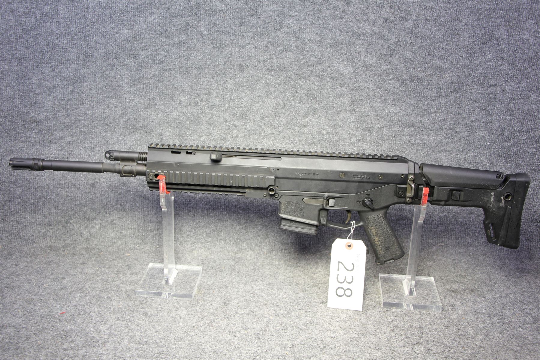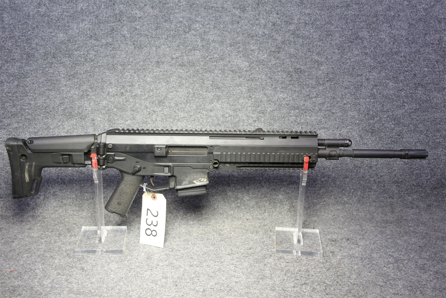 Still non-restricted. Some minor finish scuffs. Multi caliber. Folding stock. Flash suppressor.