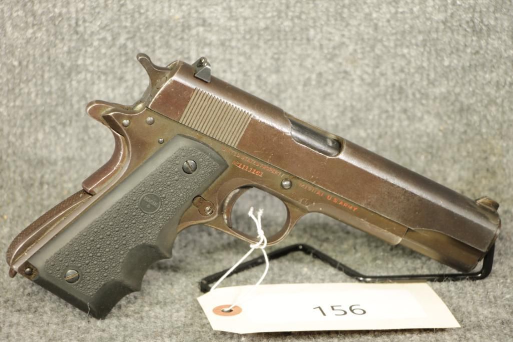 Made by Ithaca. Ser. #1111161. Made 1943. Expected patina. Some buffed out pitting on left side of slide.