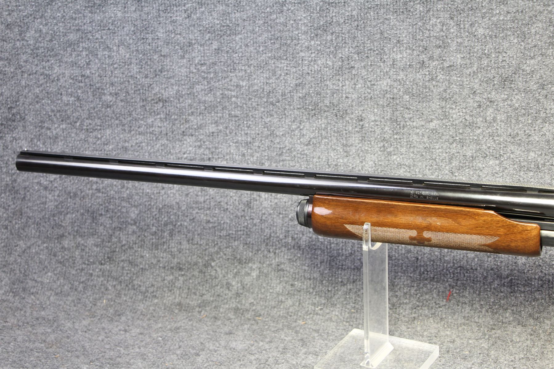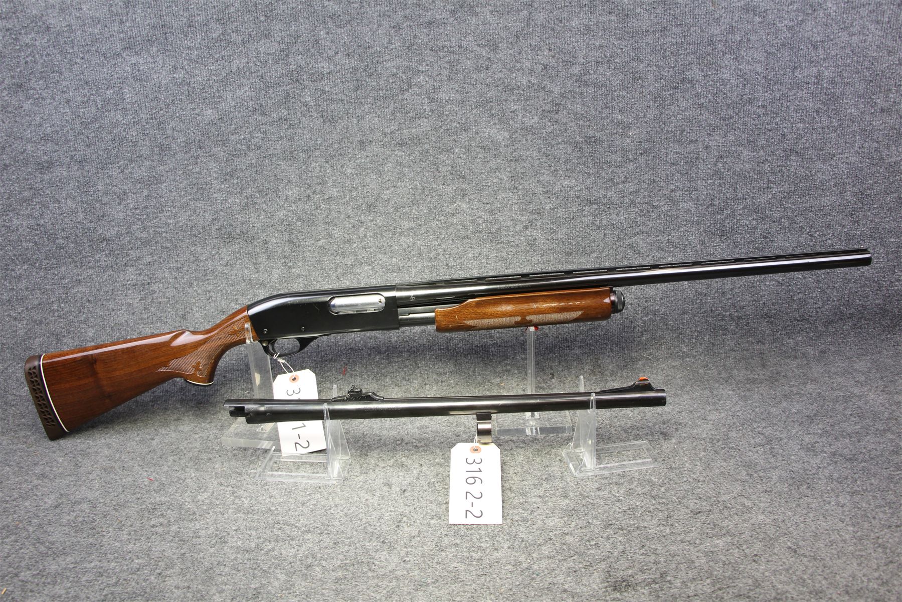 With cyl bore and a smooth slug barrel with rifle sights. Recoil pad. Hight gloss finish. Minor handling marks on the wood. No marks on the metal.