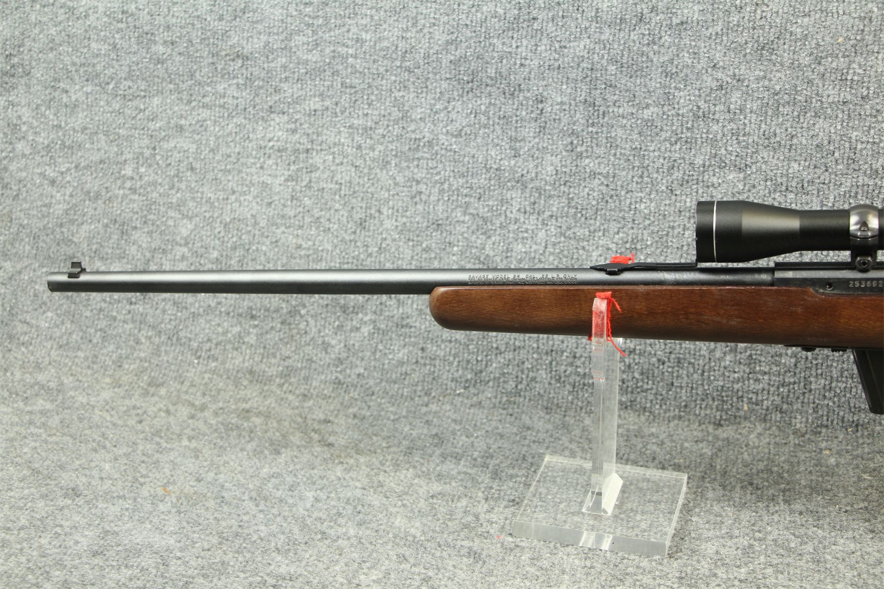 In great condition. Some very slight tarnish marks on the stock. Tasco 3-9x scope.