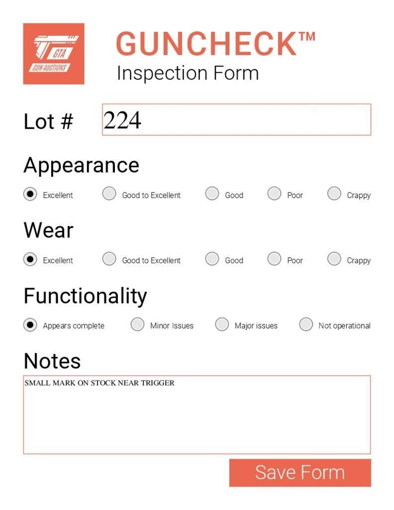 TERMS & CONDITIONS: The highest bidder shall be the purchaser and the decision of the auctioneer relating to all matters is final. All sales are final, however, we do warranty the guns we sell will function or we will repair at our cost. 30 day maximum warranty. While we improve the quality transparency through GUNCHECKTM and CYCLECHECKTM, all merchandise is sold in an 'as is' condition without recourse to the vendor not withstanding our functionality warranty. All goods advertised or displayed are subject to withdrawal prior to sale within the discretion of the auctioneer. The Auctioneers may reject a bid at their discretion without reason or explanation.
