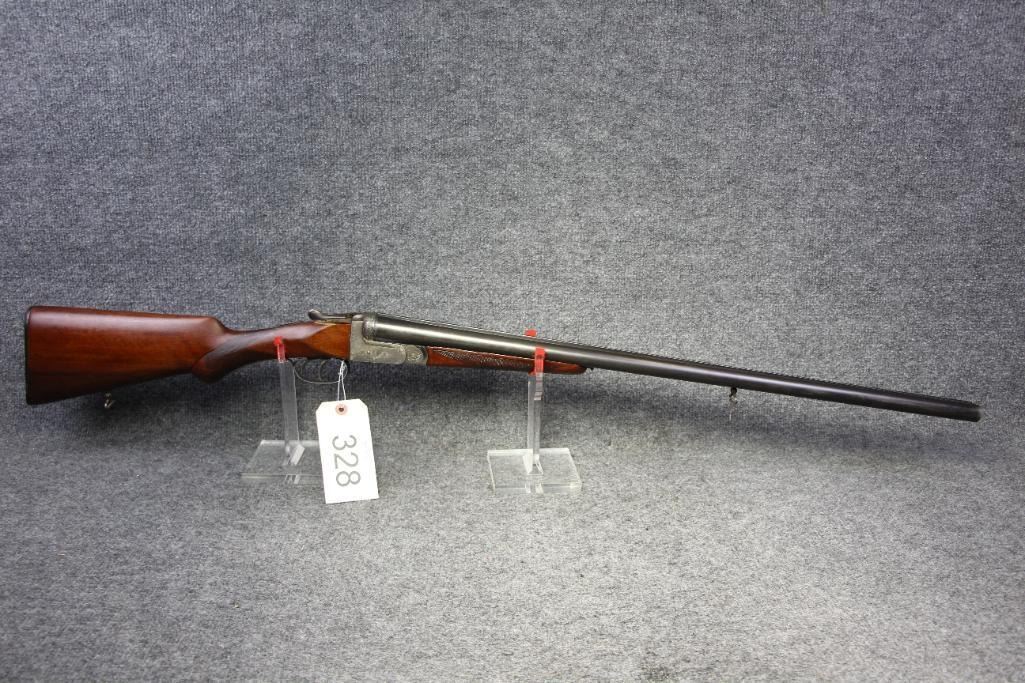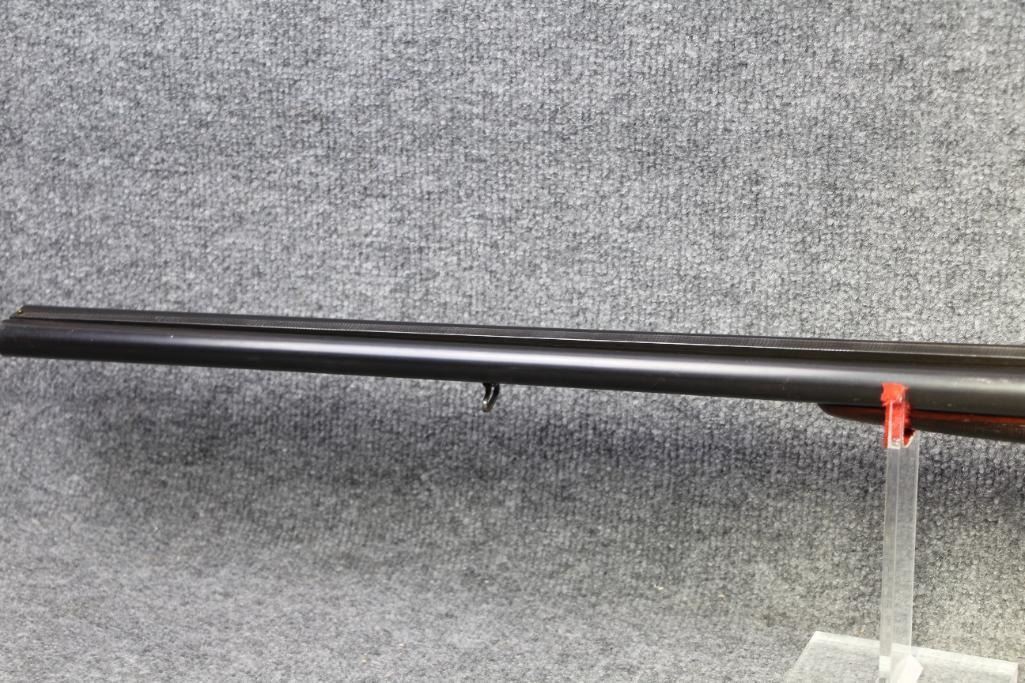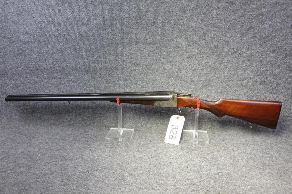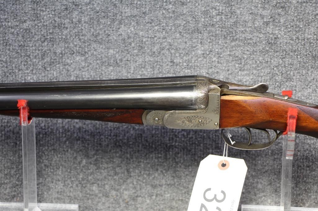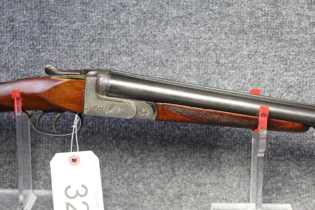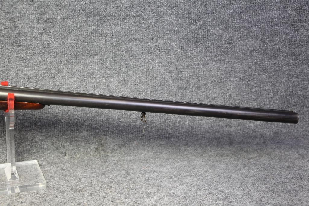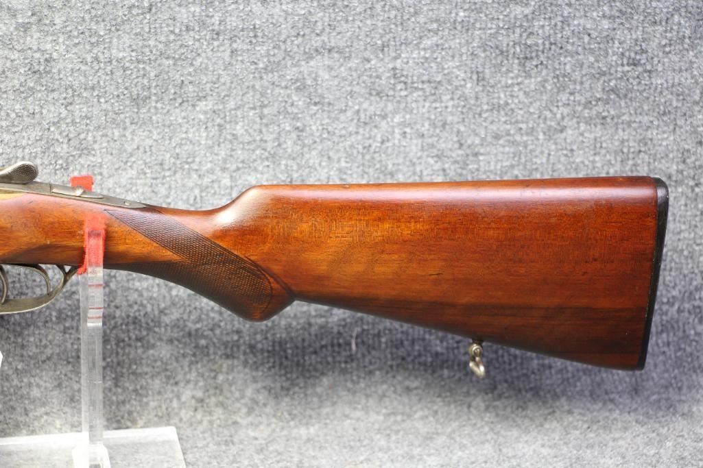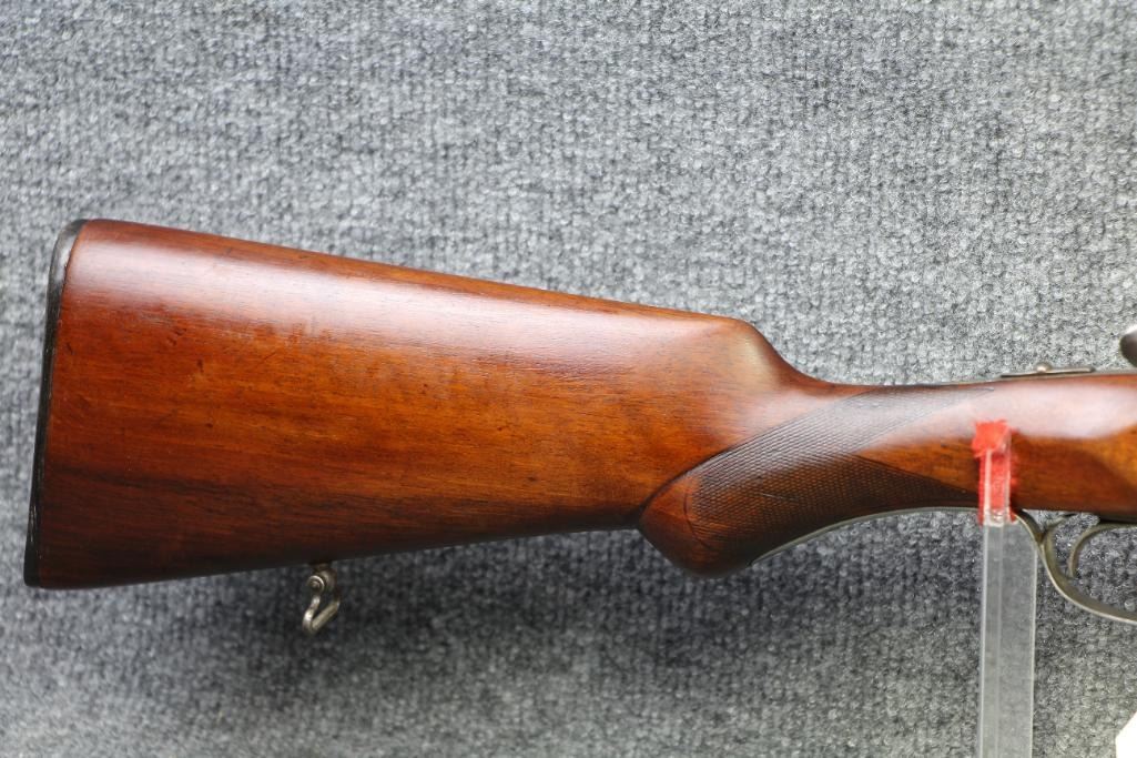 Blueing on barrels excellent. Receiver white metal. Walnut stock missing piece at tang. Refinished wood. Flat checkering.